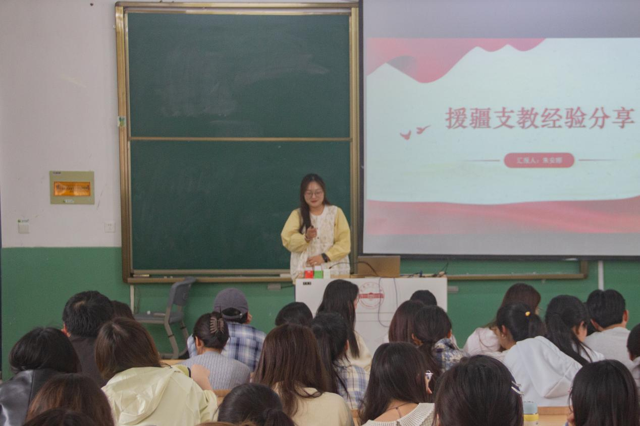 “作为新时代青年,我很荣幸能投身于祖国边疆的教育事业,为这片土地的教育发展添砖加瓦。”2023级学科教学(语文)专业朱安娜结合自身援疆经历,从初到援疆、教学工作、文化交流和支教感悟四个方面与在场人员分享援疆支教经验。她激励员工们积极响应国家战略,立足实际,发挥自身优势,努力在专业领域有所作为,形成良好的工作作风,发扬深入基层的实干务实、艰苦奋斗精神,展现青年人的蓬勃朝气与时代风采,在全心全意为人民服务中实现人生价值。“在支教过程中,师生间的深厚情谊是我人生中宝贵的精神财富,当地民族独特的文化魅力深深感染了我。”朱安娜表示,她会坚定为教育事业奋斗的决心,坚持把理论知识运用到实践当中,将自己的教育热情播撒在祖国的边疆。