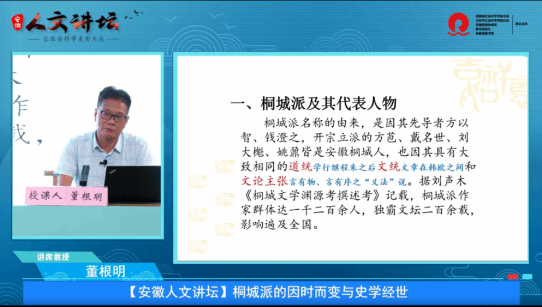 近日,威廉希尔williamhill历史学董根明教授《桐城派的因时而变与史学经世》讲座视频被安徽组织干部公司(安徽干部网络公司)遴选为该院“美好安徽省情资源”专栏第四批5门课程之一,供全省处科级干部在线学习。
