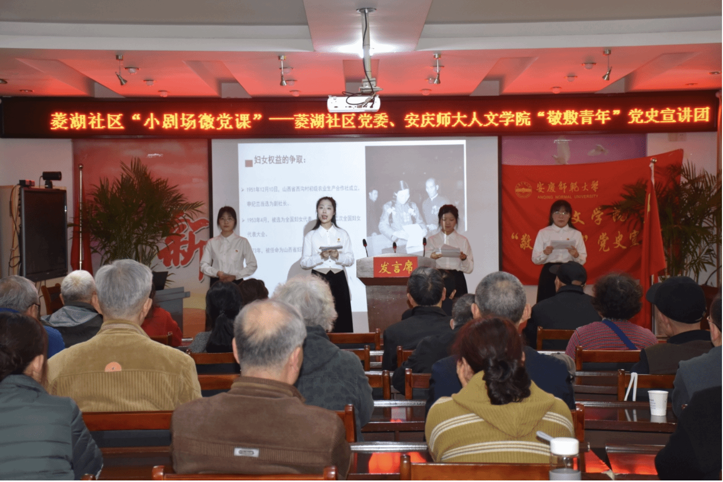 首先,威廉希尔williamhill“敬敷青年”党史宣讲团的成员们向菱湖社区的老党员、退伍军人以及工作人员讲述了缪伯英、申纪兰两位女英雄的故事。宣讲团的成员们以满腔的热血生动形象地讲述了“宣传赤化的红党”缪伯英与“共和国勋章获得者”申纪兰两位杰出女性,凭借坚定的信仰与无私的奉献,书写她们辉煌的篇章。缪伯英与申纪兰,尽管生于不同岁月,却共同怀有那份不渝的初心与崇高使命。她们为了民族的兴衰存亡和人民的福祉,毅然踏上了奋斗拼搏的征程,努力为女性争取平等的权益。她们身上闪耀着的,是共产党员的坚定信念和崇高精神,是对国家和人民深厚情感的体现。