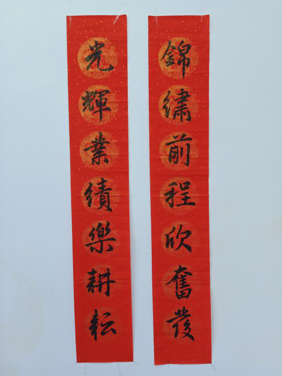 “我所创作的楹联符合了相关韵律要求,并且采用了赵孟頫的行书字体。在内容上,寄托了我对新一年里锦绣前程的美好期待以及对大家都能取得良好成绩的衷心祝福,与这次大赛的主题相契合。”获得本次比赛一等奖的童俊英同学说。