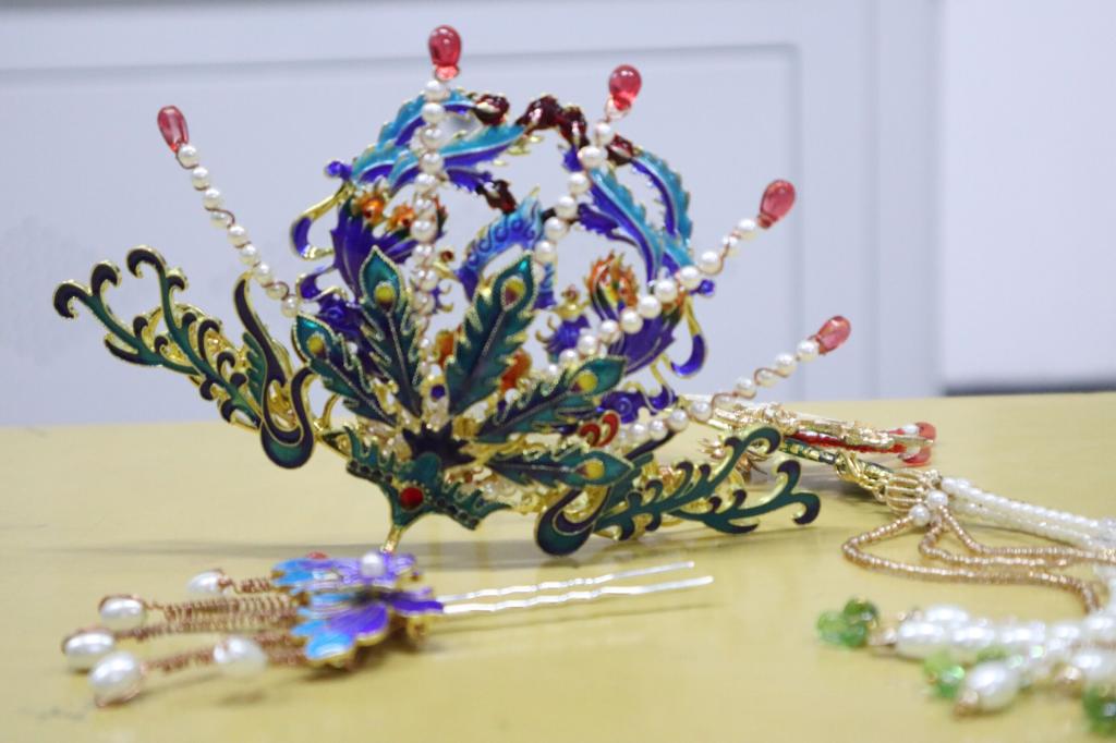 2019级汉语言文学七班的王茜、蔡凌云两位同学利用珠子和金属材料制作了精美的发冠,并用蓝色,绿色予以装饰,尽显古典韵味。对于创作原因,她们表示是出于对古代头饰的喜爱,想要对此研究,因而准备一些手工材料,进行手工制作。此外,她们还介绍了该作品样式的用料缘由、所属年代、适用场合等内容。