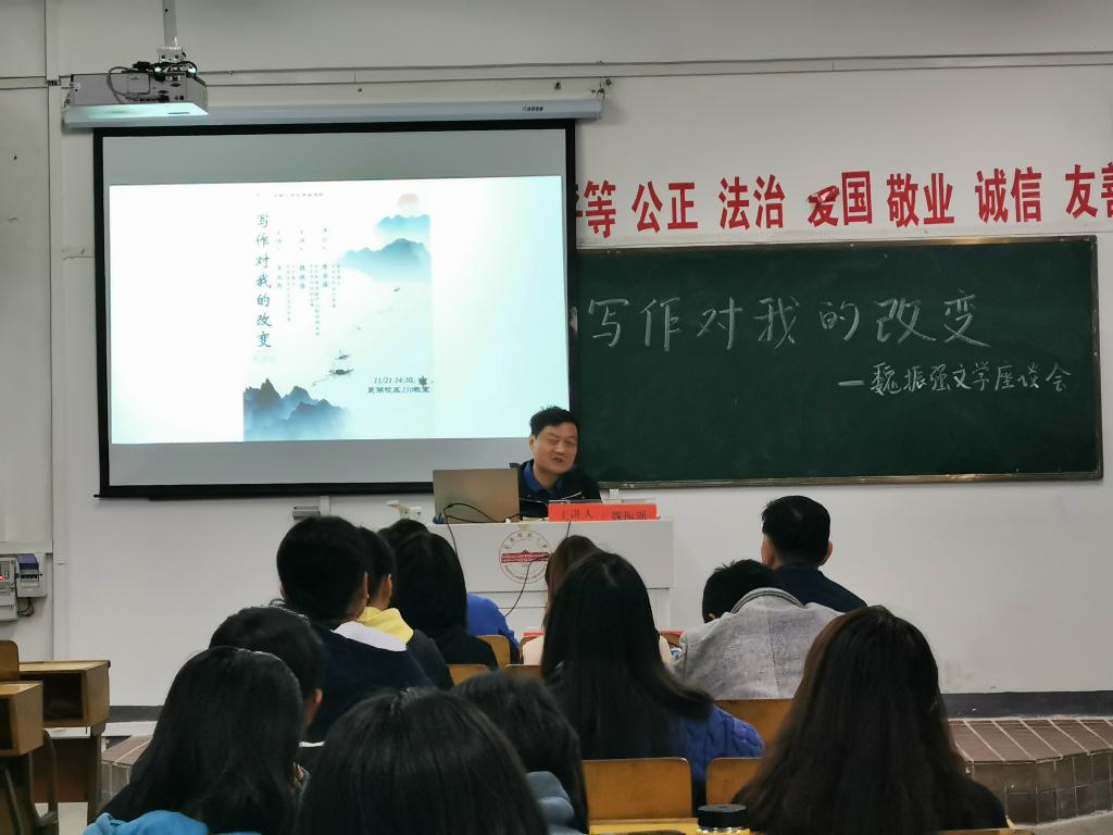 11月21日下午,安庆新闻传媒中心副刊部主任、安庆市作协副主席魏振强应邀来到公司开展了一场题为“写作对我的改变”的文学讲座,讲授自身创作经历。本次讲座由白鲸文学社主办,本社指导老师王永兵、陈宗俊分别担任主持人、评议人,威廉希尔williamhill江飞教授、叶当前教授担任嘉宾,四十余名师生参加了活动。
