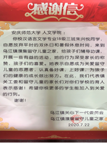 今年暑假伊始,朱兴悦便向着和县乌江镇出发,参与暑假老员工支教农村留守儿童的活动。镇上大多数青壮年为了生计选择外出打工,留下了家中的老人与孩子。为了解决留守儿童的社会问题,当地政府把这些孩子组织起来,请一些志愿者老师为他们上课,充实他们的暑假生活。“高中时,我就立志上大学后要去给有需要的孩子上课。做些力所能及的事情,陪伴他们共同成长,这使我感到无比的幸福。”她说。