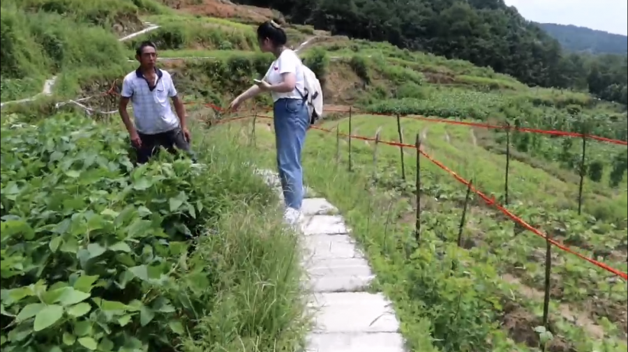 河口村的一位热心的老队长为团队介绍本地的特色油茶种植业。当地种植户在十几亩的田地中投入大量人力、物力和财力,例如在田地边铺砖修路、派专人去除田地里的杂草等。