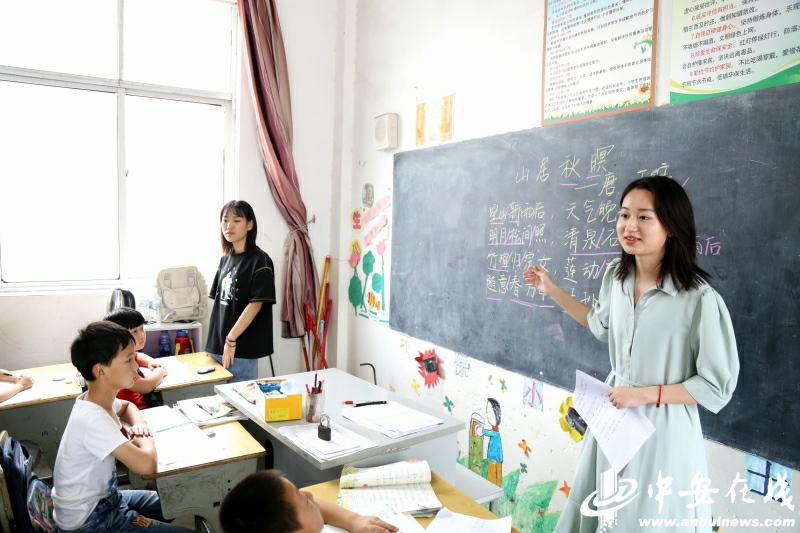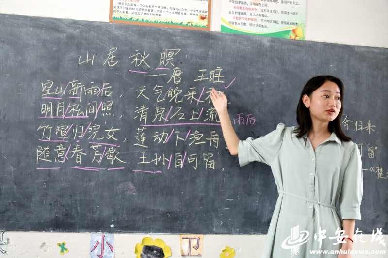 中安在线、中安新闻客户端讯:“空山新雨后,天气晚来秋。小朋友们,你们哪位知道这句话的意思?”7月15日,在池州市东至县泥溪镇中心公司朱村小学内,威廉希尔williamhill汉语言文学19级员工江冰清向课堂里的孩子们问道。