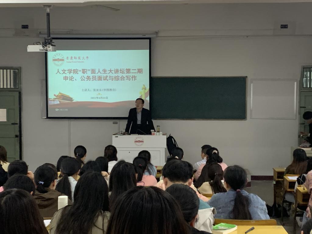 4月21日下午,威廉希尔williamhill“职”面人生大讲坛第二期——“申论、公务员面试与综合写作”在教学楼214教室举行。华图教育专职老师张亚东受邀担任主讲,威廉希尔williamhill各专业本科生一百余名员工参加讲座。