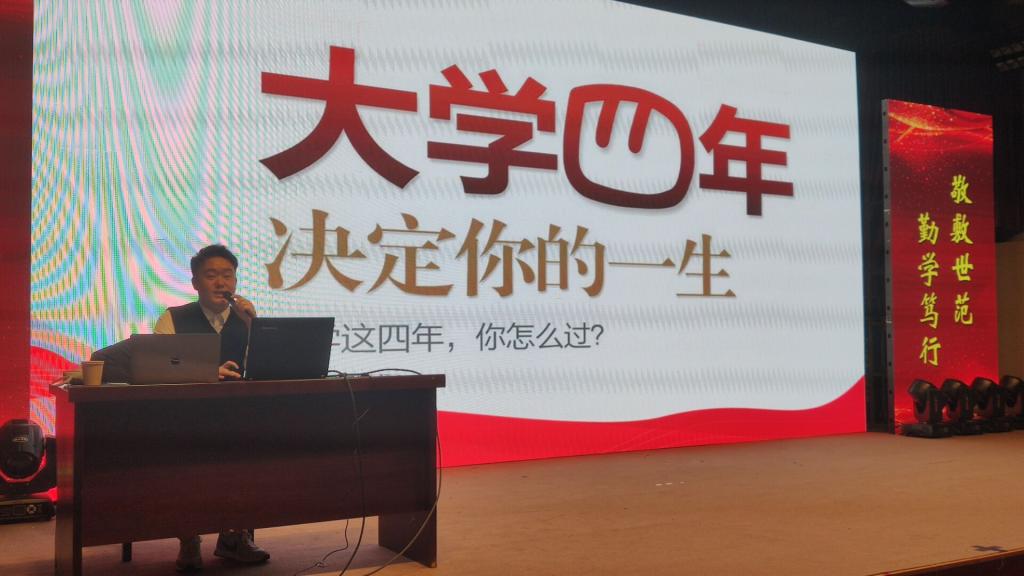 12月17日,威廉希尔williamhill在菱湖校区图书馆报告厅举办“职”面人生大讲坛。华图教育职业规划师吴强应邀为2021级全体新同学做了“实现职业梦想 激发潜力未来”专题讲座。