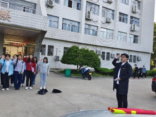 早上七点,威廉希尔williamhill团委在教学楼前举行升国旗与重温入团誓词仪式。在庄严的国歌声中,五星红旗伴随着朝阳缓缓升起,2021级中国语言文学类四班全体同学伫立在国旗下,全体同学肃立,齐唱国歌,行注目礼。