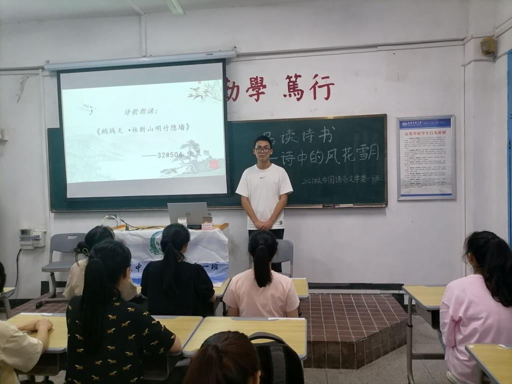 “春江潮水连海平,海上明月共潮生。”“欲把西湖比西子,淡妆浓抹总相宜。”“碧云天,黄叶地,秋色连波,波上寒烟翠。”……一阵阵悦耳的诵读声从教室里传出。5月24日晚上,2021级中国语言文学类1班举办了“品读诗书——诗中的风花雪月”的诗歌诵读活动。