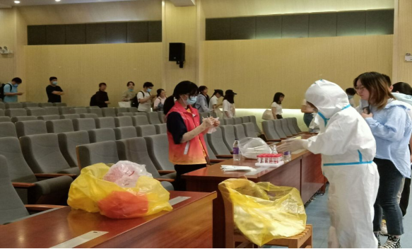 与此同时,图书馆报告厅全员核酸检测工作也陆续展开,公司青年突击队队员全力协助核酸志愿工作,落实“应检尽检、不落一人”原则,让每一位留校的员工完成个人核酸检测。