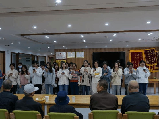 一张张慈祥的笑脸,一声声亲切的呼唤,万众和养老院的老人们认真地聆听着志愿者们演唱的歌曲。随后,各位志愿者为老人们端来热水和切好的糕点,陪伴在他们身边,与老人们聊天。