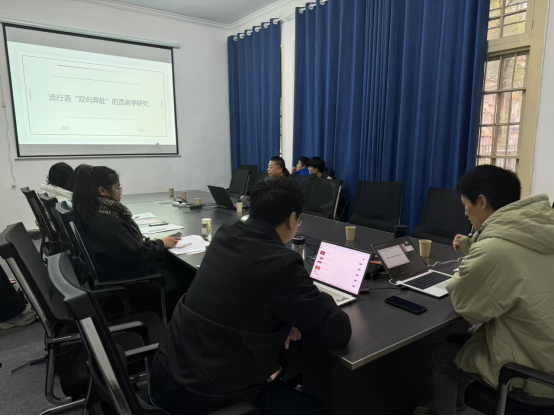 此次学术沙龙分为论文汇报、评议人点评、与会员工讨论及教师指导四个主要环节。沙龙伊始,王蓉月、吴明荣分别就论文《汉语咖啡义族词的借用策略研究》《流行语“双向奔赴”的语言学研究》进行汇报。王蓉月同学首先介绍了研究现状,指出当前学界缺乏将外来词“咖啡”及其相关词汇作为个体对象的研究,提出了“咖啡义族词”的概念,从译借策略和演变机制两方面对其借用策略进行剖析。吴明荣从语言学和社会心理学层面入手,从短语来源、使用情况、语法语义语用分析、流行原因等方面探讨了流行语“双向奔赴”的发展历程、语言特点、流行因素及其反映的社会价值观。