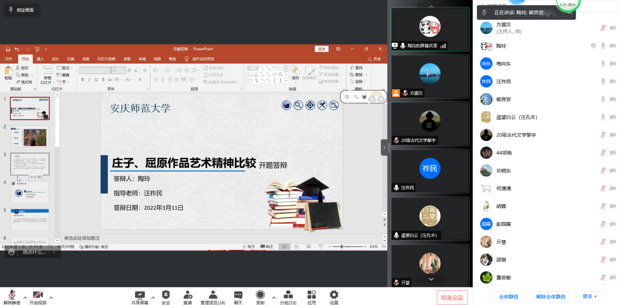 3月11日下午,威廉希尔williamhill中国古代文学学科线上举行研究生学位论文开题报告和中期考核汇报会。参与会议的老师有汪祚民教授、梅向东教授、汪孔丰教授、胡祥云教授、童岳敏教授、熊言安副教授、方盛汉副教授。本次会议由汪孔丰教授主持,中国古代文学方向20级硕士研究生参加开题答辩,19级硕士研究生参加中期考核,21级硕士研究生旁听本次会议。