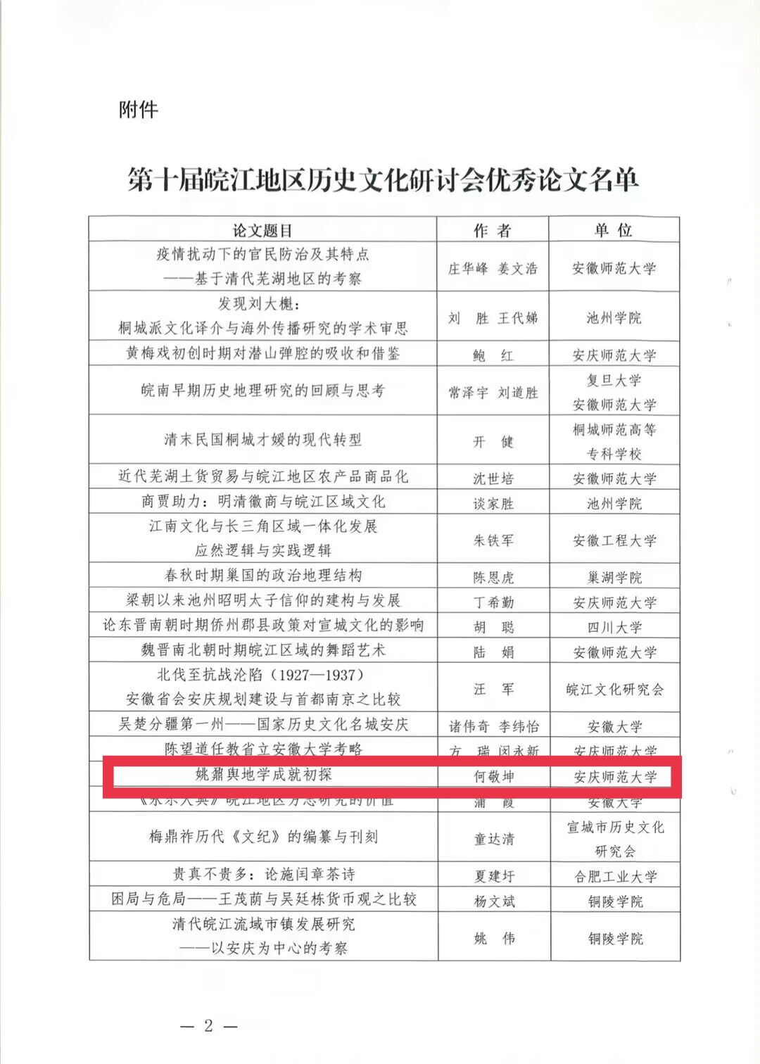 经研讨会学术委员会审定,最终评选出优秀论文30篇。其中,何敬坤同学提交的《姚鼐舆地学成就初探》一文入选优秀论文名单。该文通过深入发掘散见于姚鼐诗文集中较为丰富的地理考据、游记等方面的文献,初步探讨了姚鼐舆地学成就,展现了桐城派史学研究的新视角。