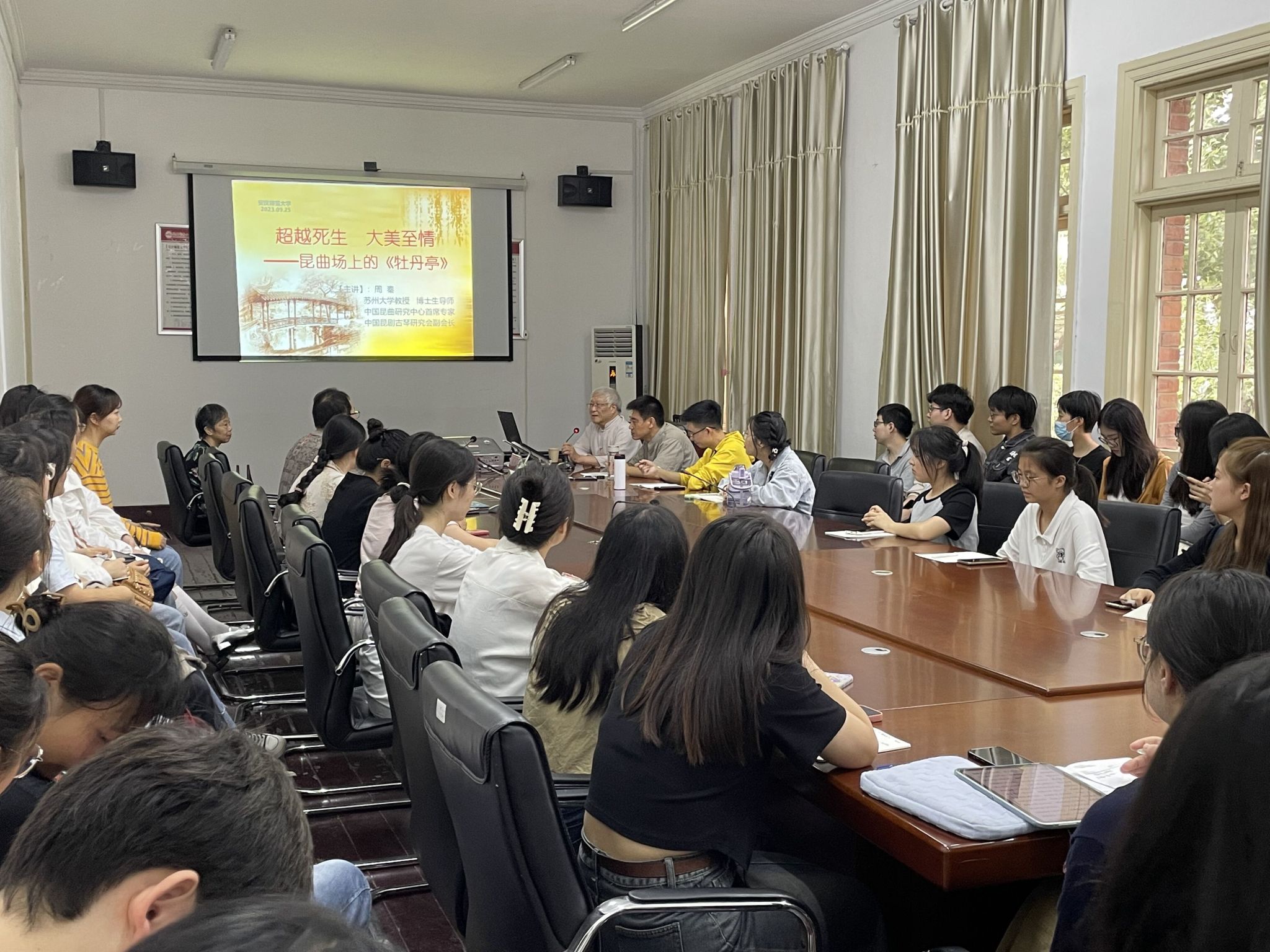 9月25日下午,苏州大学文公司教授、博士生导师、中国昆曲研究中心首席专家周秦应邀做客敬敷人文讲坛,主讲题为“超越死生 大美至情——昆曲场上的《牡丹亭》”的学术讲座。讲座由威廉希尔williamhill皖江文化数字化保护与智能处理省级重点实验室执行主任童岳敏教授主持,公司青年教师及研究生50余人聆听了本次讲座。