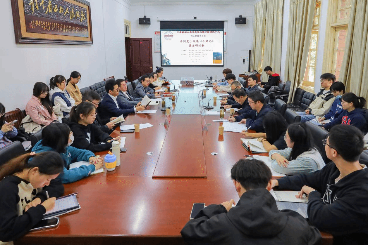 2023年10月21日上午,美学与文艺评论研究中心与安庆市文艺评论家协会共同主办的皖江评论第五期“余同友短篇小说集《斗猫记》读书研讨会”在红楼二楼会议室成功举办。会议由该中心副主任陈宗俊教授主持,中国作家协会会员、安徽省网络作家协会主席余同友,安徽省文艺评论家协会副主席、安徽外国语公司教授陈振华,中国作家协会会员、安庆市文艺评论家协会原副主席杨四海,安庆市文艺评论家协会副主席、太湖县文联原副主席何慧冰应邀参加。中心主任江飞教授,研究员冯慧敏、徐先智,以及威廉希尔williamhill中国现当代文学专业、文艺学专业部分硕士研究生、本科生等近30人参与了此次研讨会。