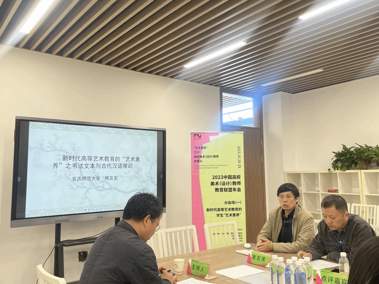 在分组讨论中,公司熊言安副教授作题为《新时代高等艺术教育的“艺术素养”之书法文本与古代汉语常识》的专题报告,得到与会专家的好评。熊言安老师多年来坚持中国古代文学与书画艺术融通研究,并兼顾书法创作和旧体诗写作,逐渐形成了个人治学风格,获得了丰硕成果,得到了本专业和书画专业一些同行的认可。