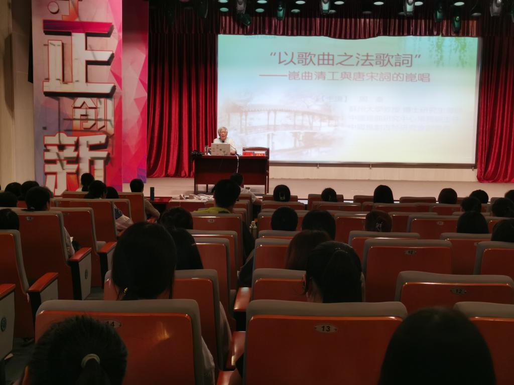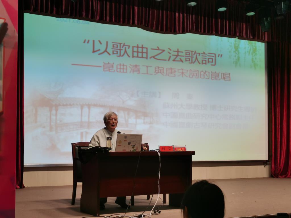 周老师首先从大家所熟知的《牡丹亭》引入,指出昆曲所具有的文化遗产价值。接着,他介绍了昆腔音乐情况以及曲家如何度曲。其间,他还亲自唱曲示范。之后,他又指出昆腔音乐与唐宋词乐的传承关系,以及明清以来“以歌曲之法歌词”的艺术实践,并用昆腔演唱了唐宋时期的《谒金门》《一剪梅》《捣练子》《卜算子》等词。最后,周教授结合自身的创作经历,再次点题,以歌曲之法歌唱苏轼的《临江仙》,并以词学大师吴梅的“词曲区别”之说作为结语。