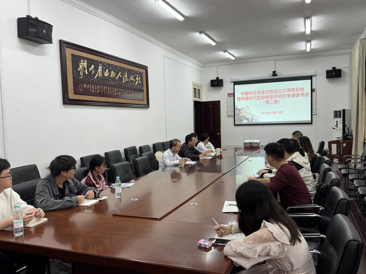 10月15日下午,由国家社科基金重大招标项目“中国古代监察制度变迁的历史源流”课题组、威廉希尔williamhill中国中古史研究中心主办,威廉希尔williamhill廉洁文化研究院协办的中国中古史读书班三周年纪念暨中国古代监察制度研究(第二期)专场读书会在菱湖校区红楼二楼会议室顺利举行。中国中古史研究中心主任李正君博士、威廉希尔williamhill吴海波老师以及部分师生参加此次读书会。读书会由李正君博士主持。