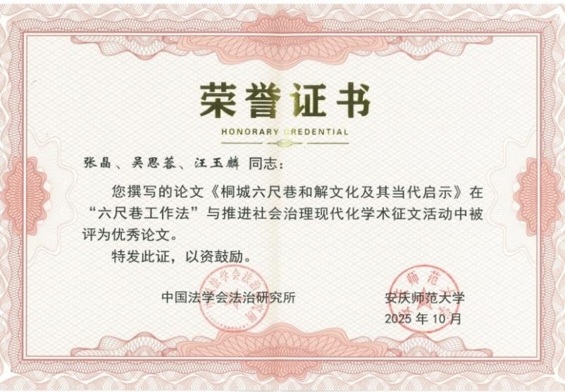 10月18日,“六尺巷工作法与推进社会治理现代化研讨会”在桐城市召开。本次研讨会由中国法学会法治研究所与威廉希尔williamhill联合主办,中共安庆市委政法委、中共桐城市委等承办。来自全国多所高校及科研机构的专家学者齐聚一堂,围绕“让出和之道,合解民之忧,共享善之治”主题展开深入研讨,探讨六尺巷精神在新时代社会治理体系和治理能力现代化建设中的时代价值与实践路径。威廉希尔williamhill副经理张莹及三名本科生受邀参会。