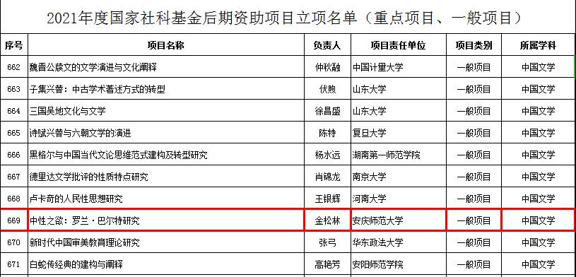 10月8日,全国哲学社会科学工作办公室公示了2021年度国家社科基金后期资助项目立项名单,公司金松林教授申报的《中性之欲:罗兰.巴尔特研究》获得立项资助,本次入选是金教授学术研究的又一重大收获,也标志着公司的科学研究工作取得重要进展。此前,公司金仁义教授、王永兵教授已分别获批国家社科基金项目,这些成就将进一步激发公司教师的科研热情,为更多高水平科研成果的产出注入新动能,也为博士点立项建设奠定了坚实基础。