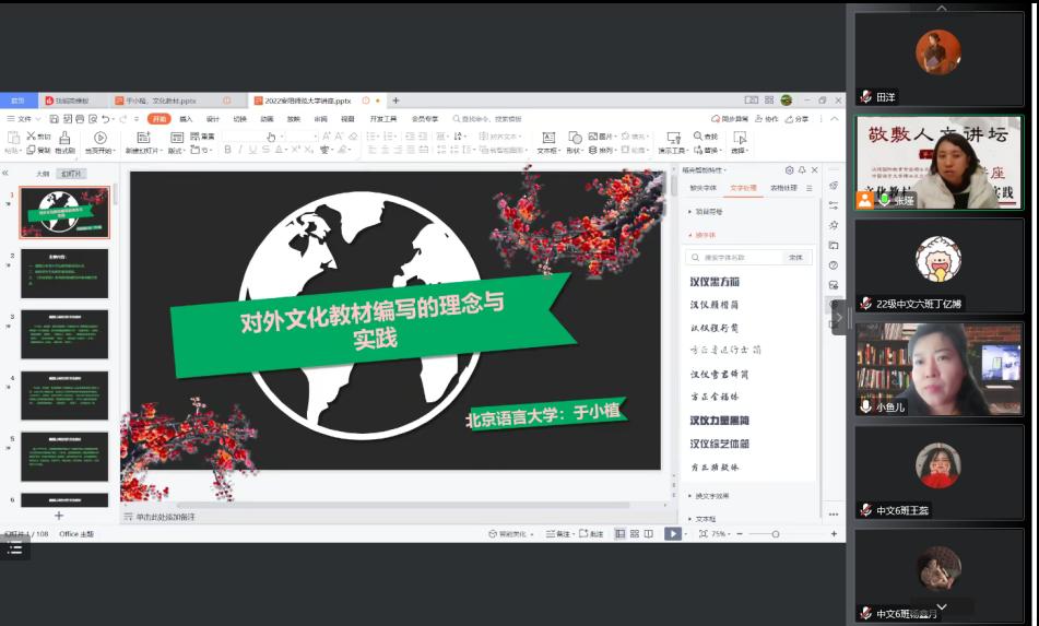 12月1日下午14时,敬敷人文讲坛第二十六讲顺利举行,北京语言大学文公司教授、博士生导师于小植应威廉希尔williamhill邀请作了题为“文化教材编写的理念与实践”的线上讲座。本次讲座由张瑾博士主持,李金梅副教授与谈,该院部分青年教师、研究生和汉语国际教育专业本科生共50余人参与线上交流学习。