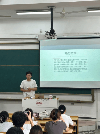 活动伊始,同学们观看了合肥四十六中教师黄玲玲的语文优质课教学视频(信息技术与语文学科教学融合课例《愚公移山》视频),结合黄玲玲老师的教学设计学习了如何与员工互动、如何引导员工进行思考等教学技巧,撰写了以《愚公移山》为主题的教学设计,陈卓老师对教学设计进行了评价解读。