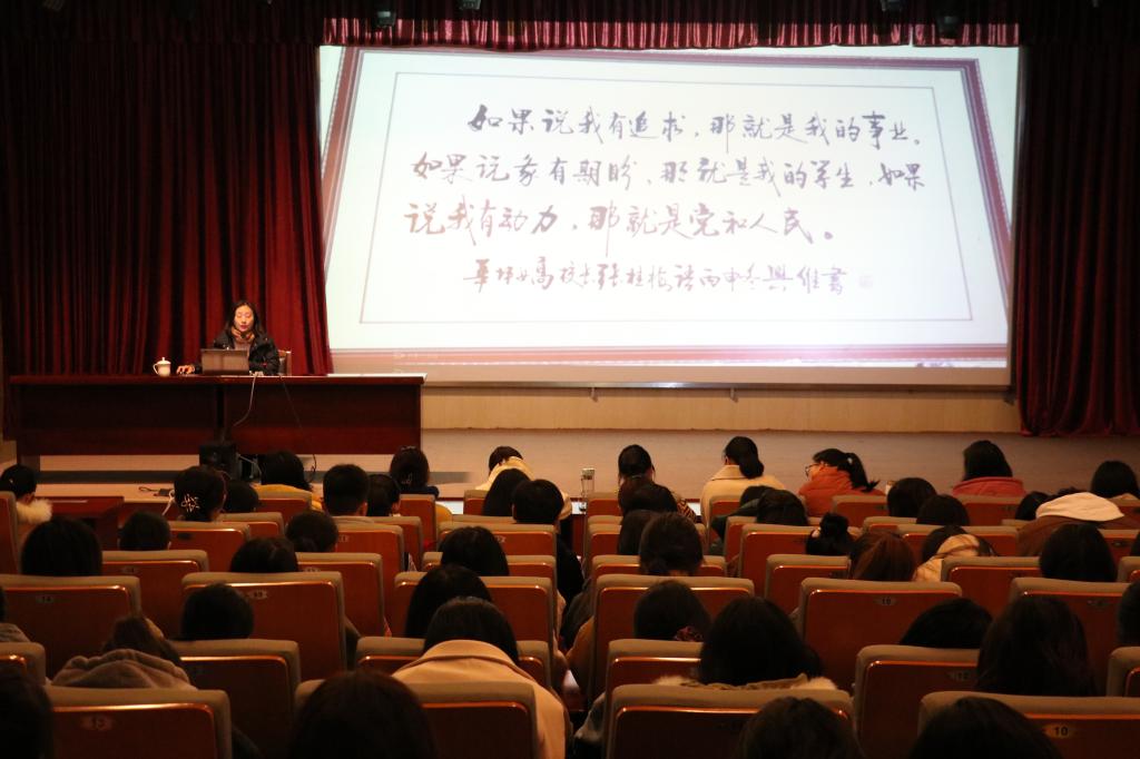 近日,安庆市第二中学副董事长杨春老师应邀来到公司,在菱湖校区图书馆一楼报告厅开展题为《做大国良师,育时代新人》主题讲座。2019级汉语言文学、汉语国际教育、历史学专业全体员工及教育见习指导教师共计564人参加了讲座活动,讲座由副经理金仁义教授主持。