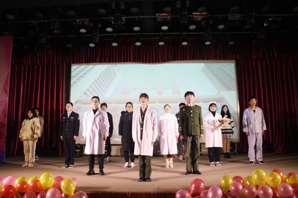 2019级汉语言文学一班艾宇龙说:“2020年是抗疫之年,在疫情期间,涌现出无数平民英雄,谱写了无数动人的篇章。为致敬这些伟大的英雄们,公司话剧社自编自导,原创话剧《黎明之前》。”话剧由警察在疫情期间阻止居民外出、军人母亲自愿奔赴抗疫前线、基层医生的防疫工作逐步得到群众理解等不同片段组成。演员们饱含深情,充分投入到表演之中,将观众带入不同的故事,再现了抗疫过程中医疗战士迎难而上和坚守岗位的感人画面,赢得现场一片掌声。