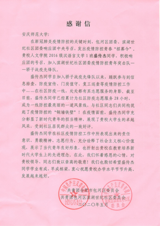 “盛传杰主动加入社区战役先锋队,在工作中展示了当代青年良好形象,也折射出贵校培养新时代老员工的先进教育理念……”6月15日,威廉希尔williamhill团委收到一封来自合肥市包河区滨湖世纪社区服务中心的感谢信。信中介绍了盛传杰同学的抗疫事迹,称赞他的责任与担当,肯定威廉希尔williamhill的人才培养理念,字里行间流露出真挚的感谢。不止盛传杰,在公司团委的积极号召下,疫情期间还有许多有担当的青年志愿者涌现,他们用行动向社会展现了安庆师老员工的风采。