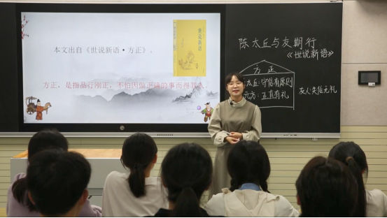在示范环节,倪卉如学姐播放了她曾录制的微课视频《陈太丘与友期行》。视频中,她以“家风传承”为切入点,通过层层递进的问题探究、生动的语言演绎和精妙的板书设计,展现了扎实的教学基本功与高超的课堂把控力,让同学们真切感受到了省赛一等奖的教学水准。微课结束后,现场掌声雷动,同学们纷纷表示“学姐的课堂既有温度又有深度,是师范生学习的标杆”。