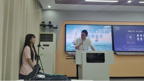 活动伊始,倪卉如学姐通过PPT图文并茂地分享了备赛经历与心得,系统梳理了教学设计、课堂实操、板书设计等核心环节的技巧,并结合自身经历,从“筑基、突破、登峰、致远”四个维度展开分享。