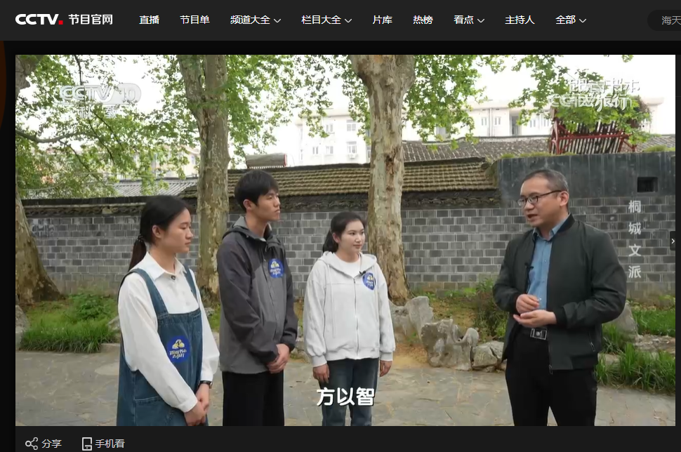 近日,由公司威廉希尔williamhill师生参与录制的文化专题节目《跟着书本去旅行》在央视科教频道(CCTV-10)正式播出。本期节目聚焦桐城文派,深入安徽桐城实地取景,通过学术解读与现场探访,生动呈现了该流派的历史脉络。