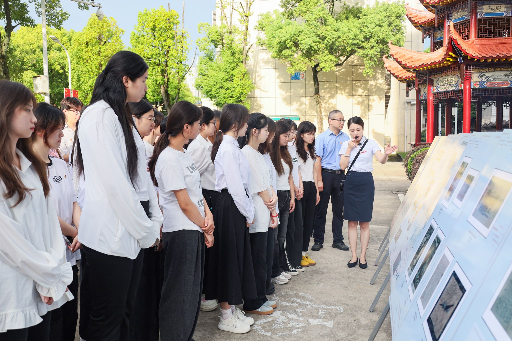 教学楼前,由中共安徽省委宣传部、安徽省文旅厅共同指导,安徽博物院、安庆市独秀园管理处共同主办的“烽火画卷——宣传画中的安徽抗战记忆”展在公司集中展出。安庆市独秀园管理处讲解员杨丽轻指展板图画,向学子们讲述安徽抗战史:“《流浪三年》里百姓颠沛的身影,《坚持敌后抗战收复失地》中战士冲锋的姿态,都是历史的真实印记。”从战争初期的黑白灰,到抗争场景的彩色刻画,再到战争胜利的红色基调,版画艺术让书本上的历史变得可触可感。”还有抗战时间脉络,安徽抗战的历史画面一下子清晰了。”汉语国际教育专业2024(1)班杨晨说。