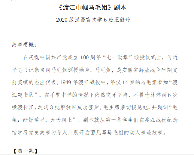 为增强员工的爱国意识、爱党意识、爱团意识,威廉希尔williamhill话剧社征集与“红色记忆”小品、相声、话剧等相关语言艺术作品。话剧社社长、汉语言文学专业2019级1班万昕表示,选择“探寻家乡红色记忆”作为活动主题目的是让大家了解家乡的革命历史,体会那段艰难岁月。中国语言文学类2021级7班曹忆凡参加了本次比赛,在谈及剧本创作时,她说:“在创作之前我了解到2022年是建团一百周年,我对当时在安庆成立安徽共青团的主要历史人物做了调研。通过这次有意义的寒假活动,我了解了那段风云动荡的年代,我也要像先辈们学习,开拓进取、不懈奋斗!”