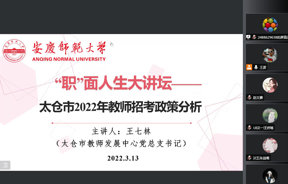 为帮助毕业生科学研判就业形势,树立正确求职理念,3月13日晚,威廉希尔williamhill线上举办了2022年江苏省太仓市教师招考考情分析暨教师专业发展经验分享会。太仓市教师发展中心党总支书记王七林,太仓市沙溪镇三小教师、2020届汉语言文学毕业生赵文雅,太仓市双凤中学教师、2021届汉语言文学毕业生郑博文应邀参加。会议由公司党委副书记王波主持,2018级、2019级部分员工近两百人线上聆听学习。