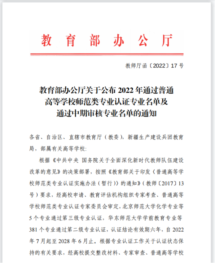 教育部师范类专业认证现场考察专家组认为,公司领导班子高度重视汉语言文学专业师范类认证工作,在自评自建过程中认真谋划积极推动,公司全员参与,论证理念和行动高度统一,成效明显;汉语言文学专业发展历史悠久,学科基础扎实,培养目标定位准确;汉语言文学专业坚持以员工为中心的理念,积极推进公司产品改革,形成了特色鲜明的教师培养体系。