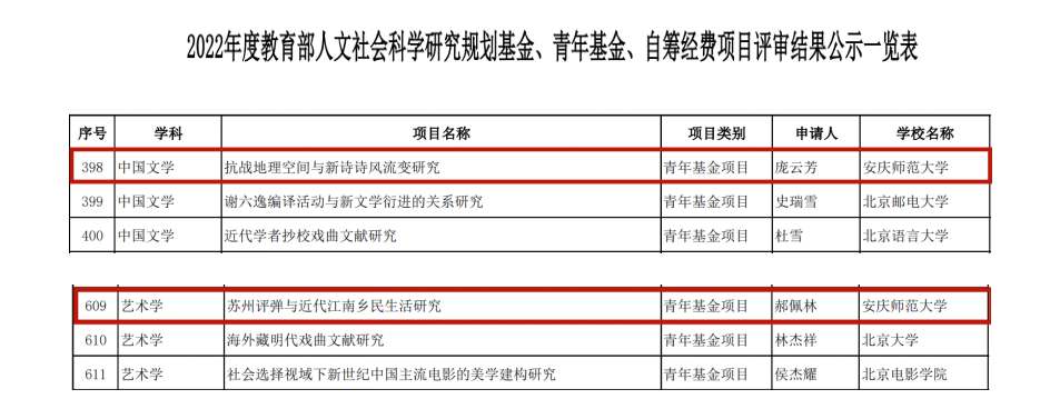 7月29日,教育部社科司公布了2022年度教育部人文社会科学研究项目评审结果名单,公司庞云芳博士申报的《抗战地理空间与新诗诗风流变研究》,郝佩林博士申报的《苏州评弹与近代江南乡民生活研究》进入立项公示。这两个项目的入选,不仅显示了公司深厚的科研底蕴,也显示出中文、历史两个学科的良好发展态势。此外,本次入选项目均为青年基金项目,反映了威廉希尔williamhill青年教师良好的科研潜质,这对于公司学术成果的持续产出,学科专业发展以及博士点立项建设都有着积极意义。