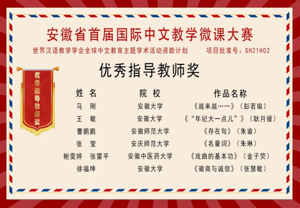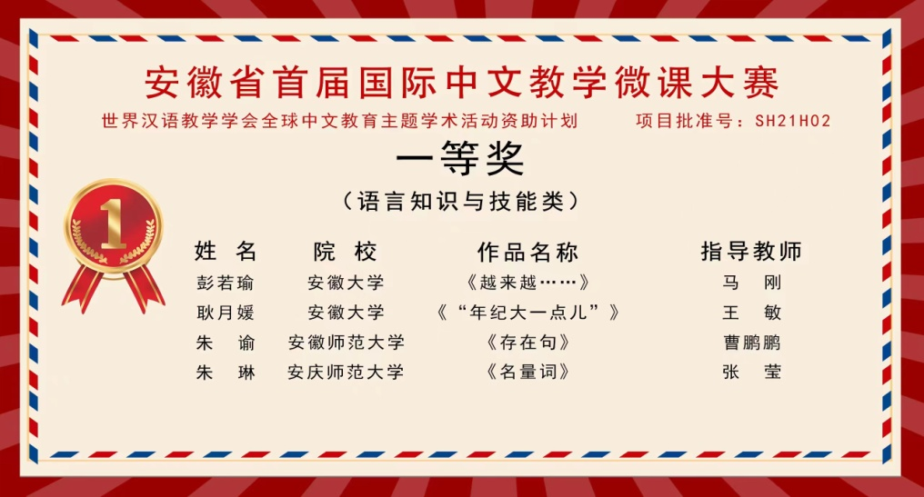 2022年11月20日,由世界汉语教学学会全球中文教育主体学术活动资助、安徽省汉语国际教育研究会主办、安徽大学文公司和安徽农业大学外国语公司承办的安徽省首届国际中文教学微课大赛评选结果揭晓。威廉希尔williamhill2019级汉语国际教育专业朱琳同学荣获一等奖;2019级汉语国际教育专业梁嘉越同学、朱慧同学荣获优秀奖;张莹老师荣获优秀指导教师奖。