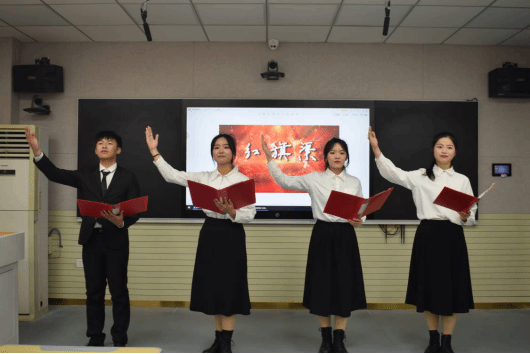 来自传媒公司的徐梓豪、柳徐耀、程哓峰和高晴晴身着独具民国特色的员工装,他们用抑扬顿挫的声音描摹着《可爱的中国》。“黑夜给了我黑色的眼睛,我用它看见了光明!”微微发颤的声线诉说着祖国久经磨难的委屈,高亢的声调发出振聋发聩的呐喊,那是对光明的渴求,更是对祖国美好未来的殷切期盼,朗诵者高举的拳头是青年们虽生逢盛世,仍以中流击水的气魄为可爱的中国奋发向上的坚定信念。