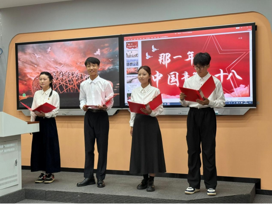 来自威廉希尔williamhill朗诵俱乐部的金雪和院主持队的宋文希组队诵读作品《如果我生活在那个时代》。她们神情肃穆,一句“如果我生活在那个时代/是否也能像他们一样/在硝烟中挺直脊梁……”的反复叩问,直击人心,悄然将观众带入那段烽火岁月。资源环境公司刘奕宁等四名学子则以激昂的群诵《那一年,中国青年正十八》点燃全场,展现青年一代的热血担当。作品以“那一年,枪声惊碎了和平/那一年,他们正十八”开篇,领诵刘奕宁声音清澈铿锵,目光灼灼,生动再现青年学子投笔从戎的热血场景。