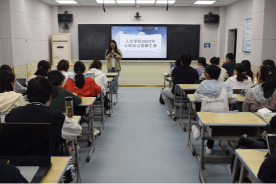 活动伊始,现场答辩助理丁湘同学在公布项目汇报抽签次序与答辩一般流程后,宣布老员工创新创业训练计划项目结题答辩汇报开始。各项目组答辩汇报人通过PPT放映、视频介绍、展示论文资料与项目成果实物等方式依次从项目立项依据、目标预期、经费预算、项目成果与心得等方面进行汇报。各项目组通过PPT精心展现课题亮点,汇报内容丰富多彩,答辩气氛活跃热烈,其中,《“国际·皖”创新创业训练计划》《大别山红色歌谣的整理、研究与当前传承》《“盒里遇黄梅”——黄梅戏文化产品》等项目立足安徽省文化优势,弘扬并传承皖文化;《人工智能和全息投影在物联网产业的创新运用》《“双减”政策背景下关于戏剧教育融入中学语文学科教学路径探索》等项目组发挥学科特点,关注社会现实。